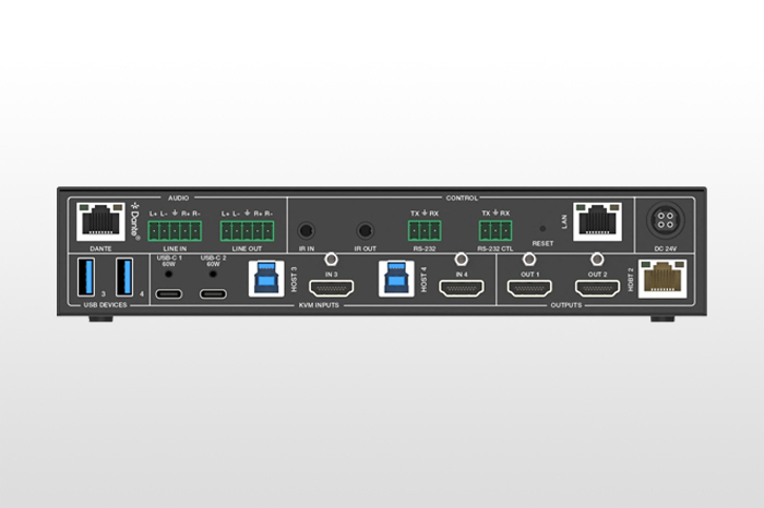 輸出:1x HDMI, 1x HDMI+1x HDBaseT 鏡像, 1x 模擬音頻, 1x Dante 2ch